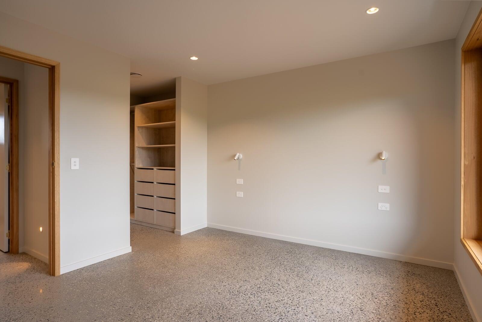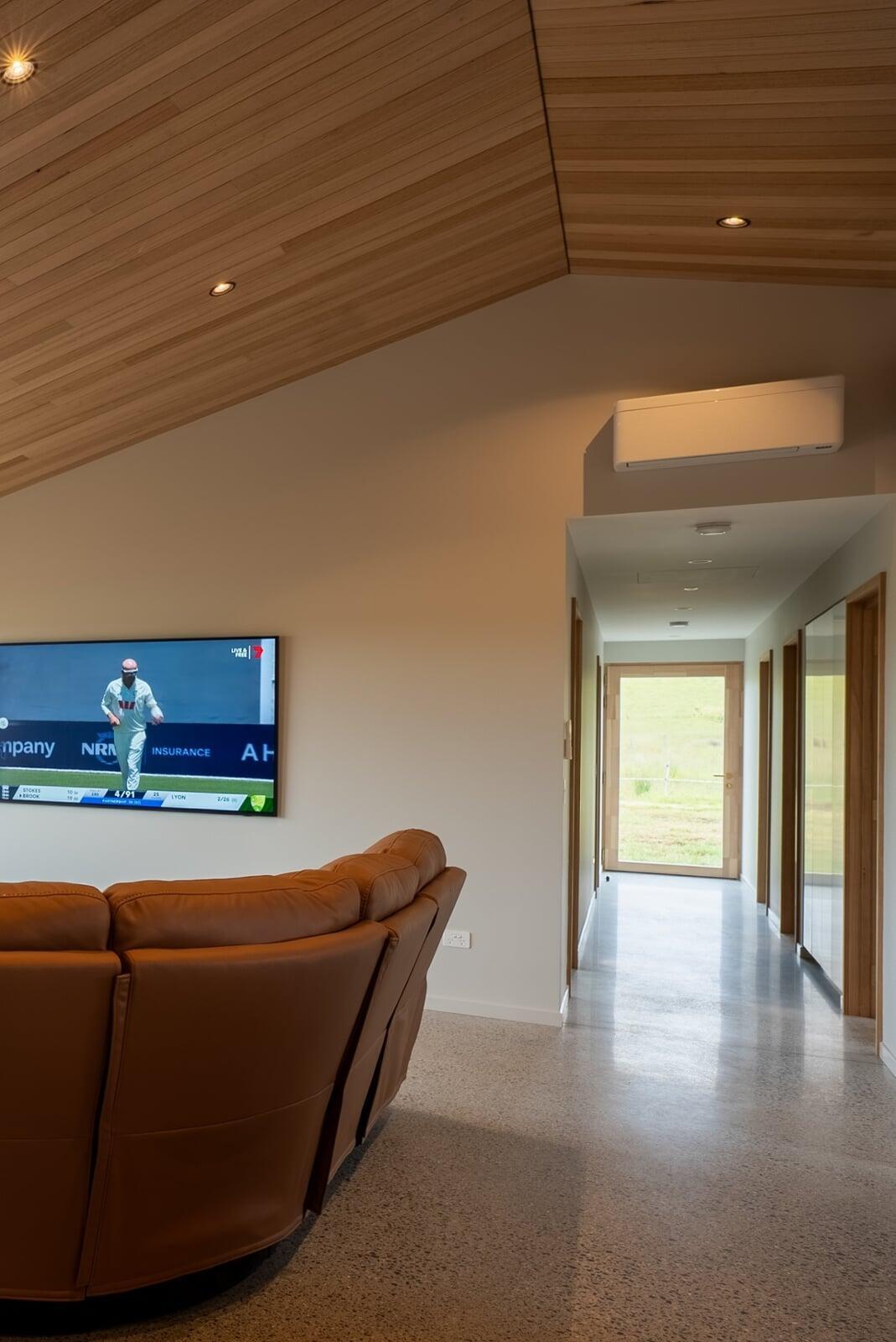 The home is strategically sited to maximise solar gain, utilising ground-rock aggregate concrete floors to act as a thermal heat bank, while a comprehensive solar system with battery storage and on-site water tanks ensure long-term resilience.