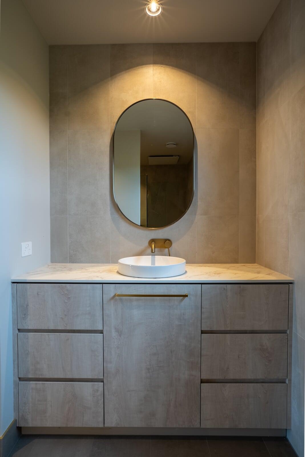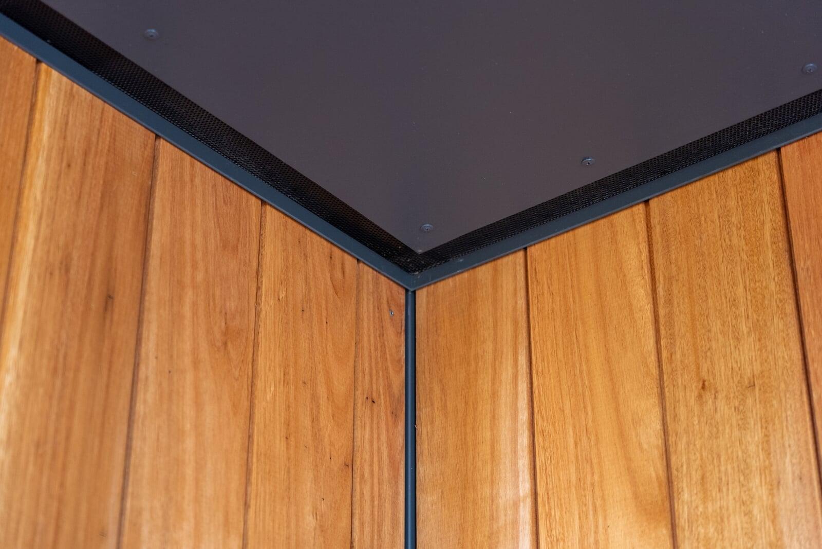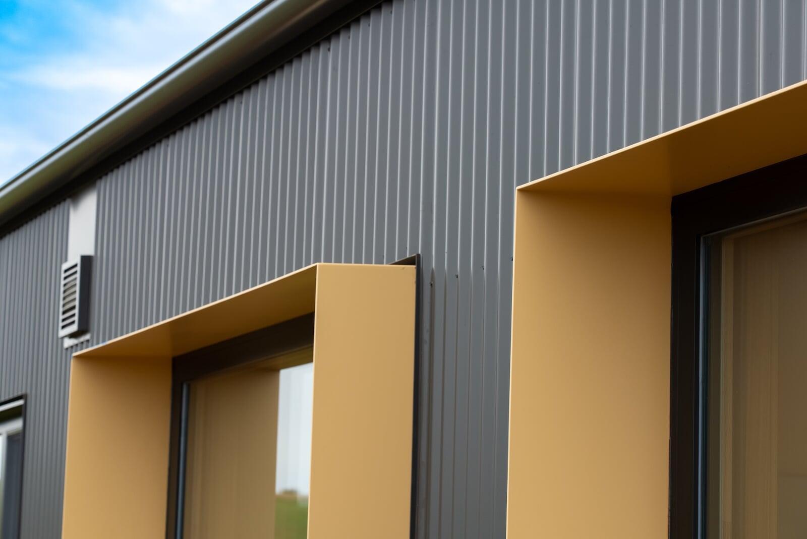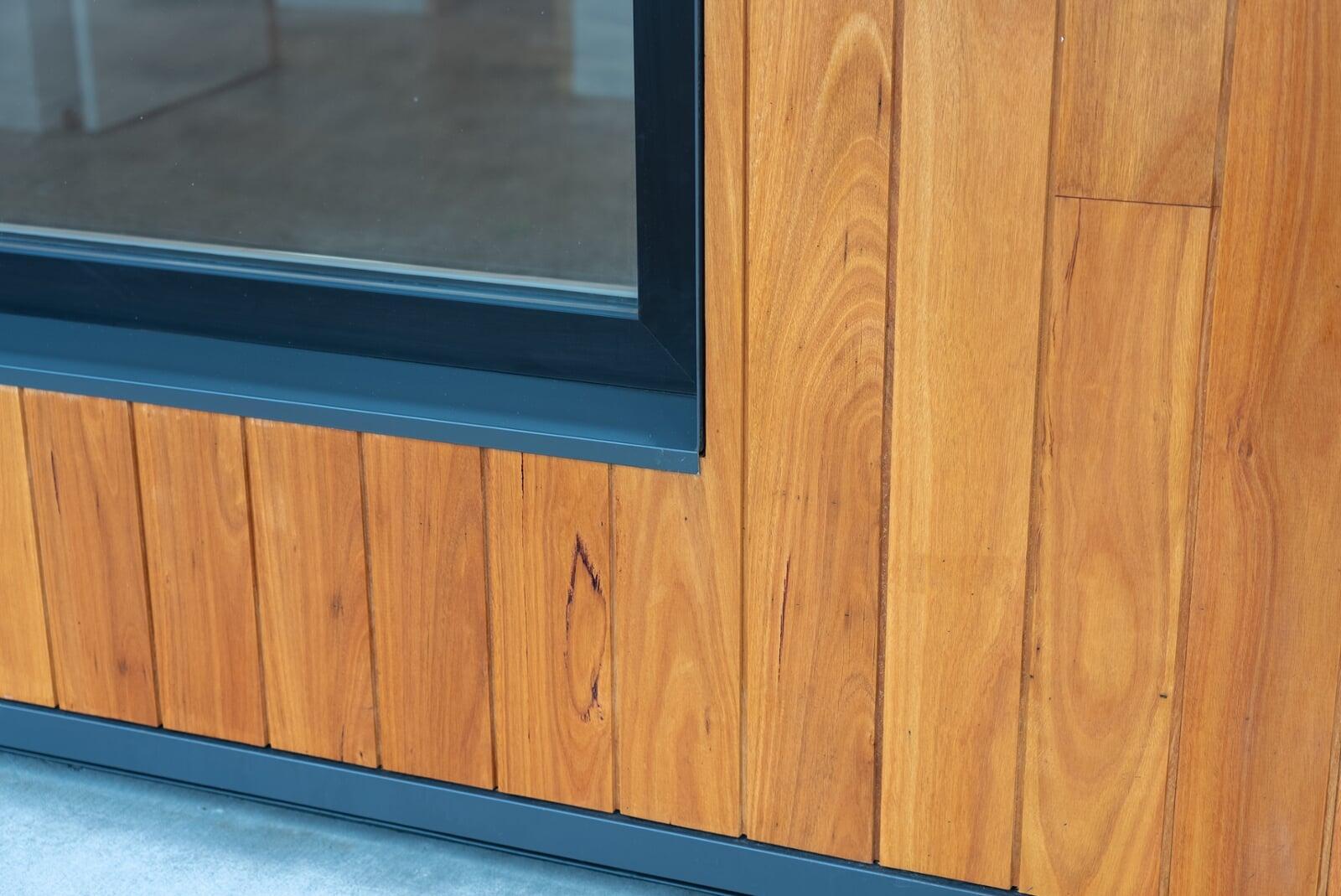 The exterior features a sophisticated, low-maintenance palette. Colorbond Custom Orb in Monument provides a sleek, corrugated skin, punctuated by custom powder-coated window shrouds in a contrasting sand-tone finish. Blackbutt timber cladding and screens add organic texture, softening the transition from the garage to the main residence via a covered walkway.