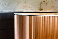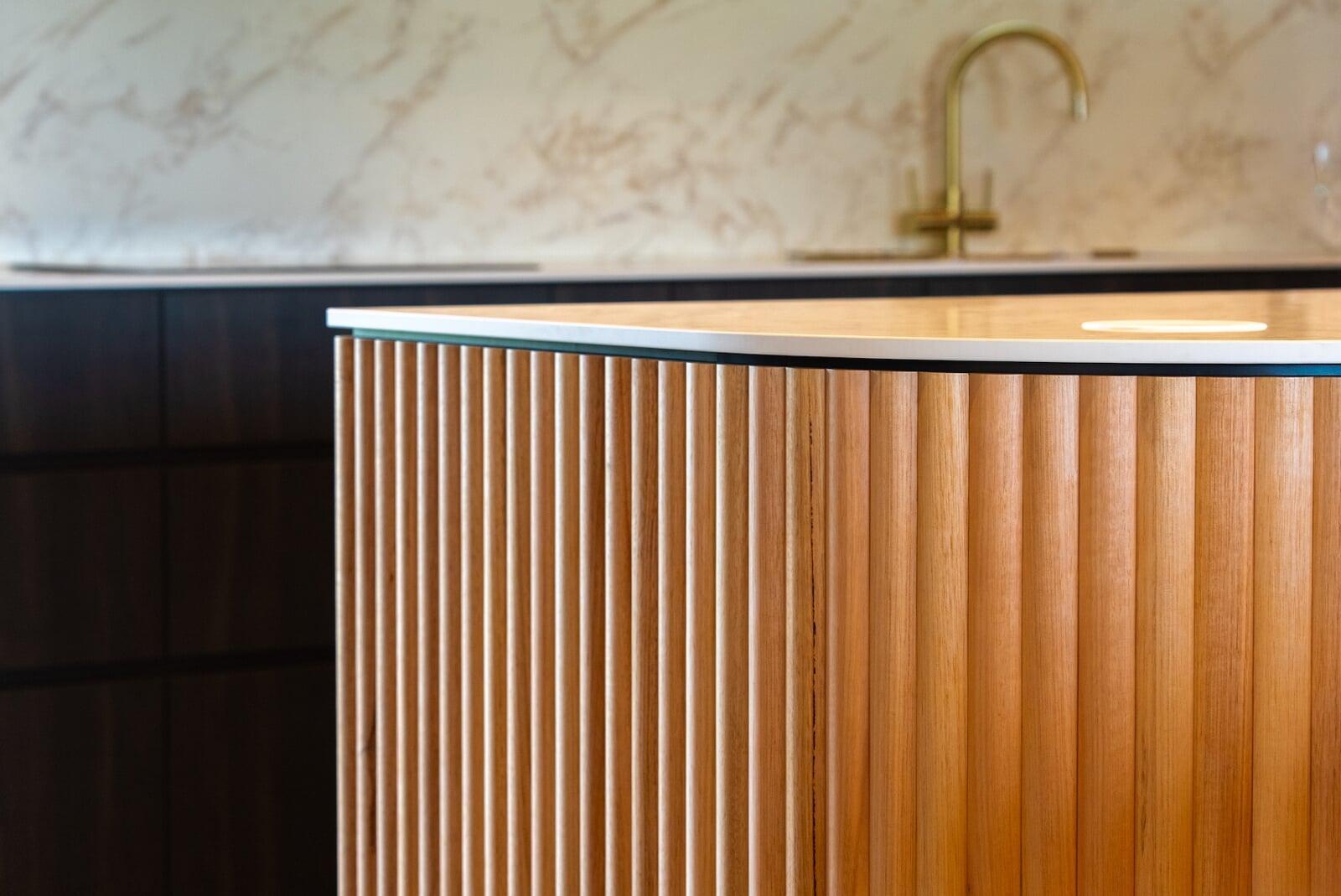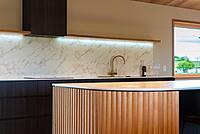 This kitchen is a masterclass in modern Australian design, balancing sleek, dark tones with the organic warmth of Tasmanian Oak. It’s designed to be the functional heart of the "Longhaus," offering a seamless blend of high-end technology and artisanal craftsmanship. Clad in Porta Contours ‘Riverine’ and topped with Polytec Xenolith benchtops in Marmo Di Torre, the three-metre long kitchen island is the centre piece of the home.