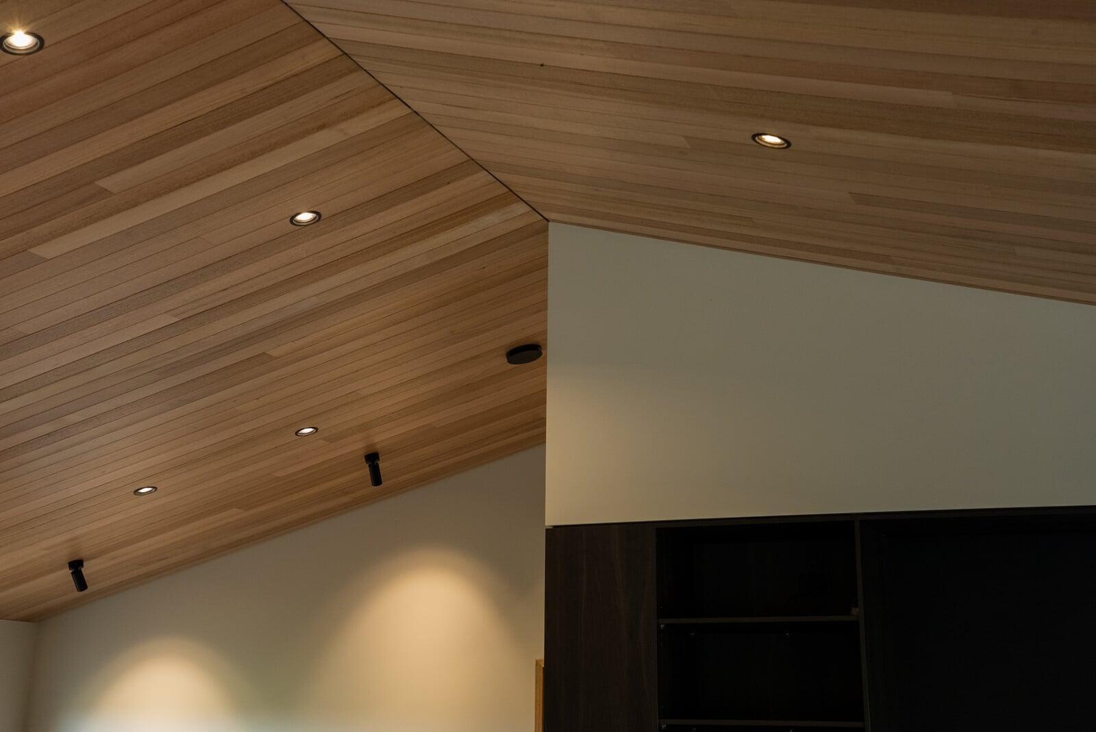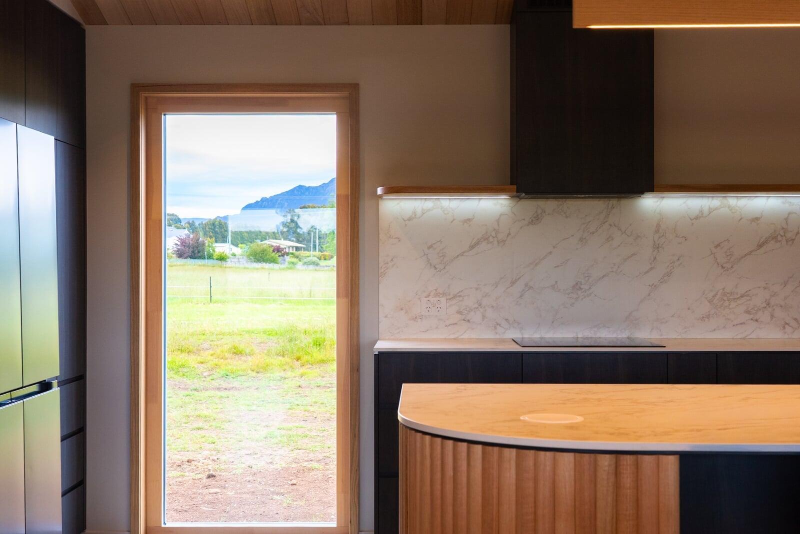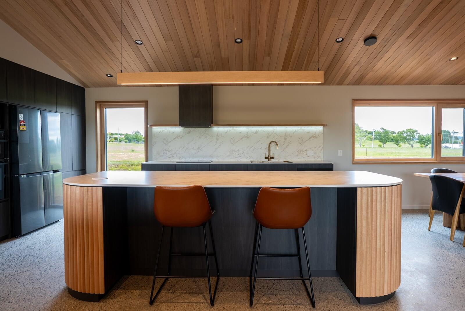 Inside, the Tasmanian Oak raked ceilings create a sense of volume and warmth in the open-plan living area.