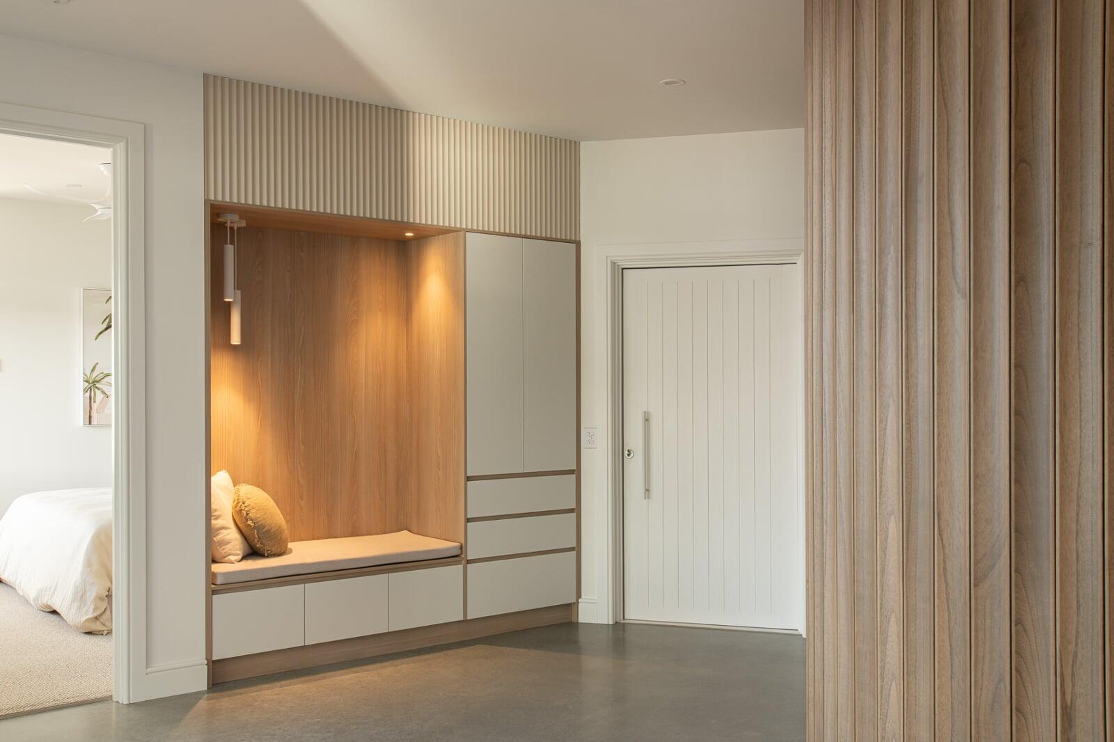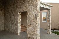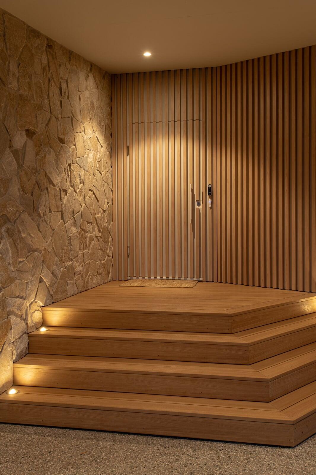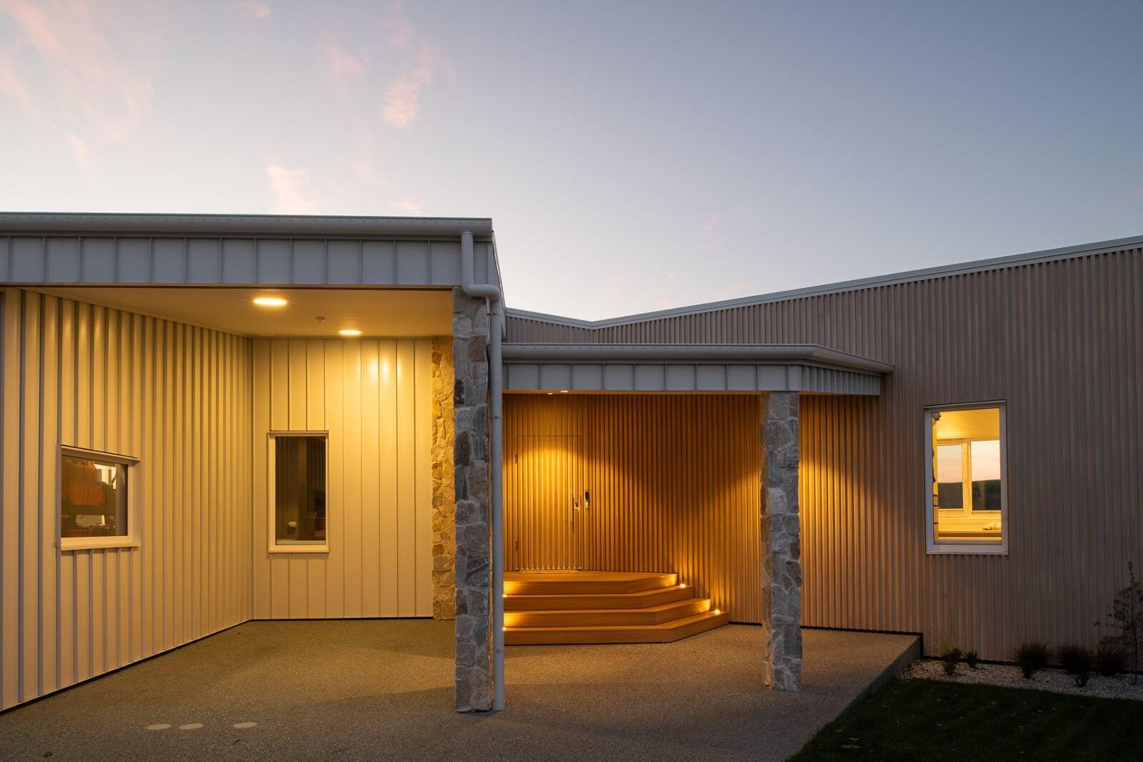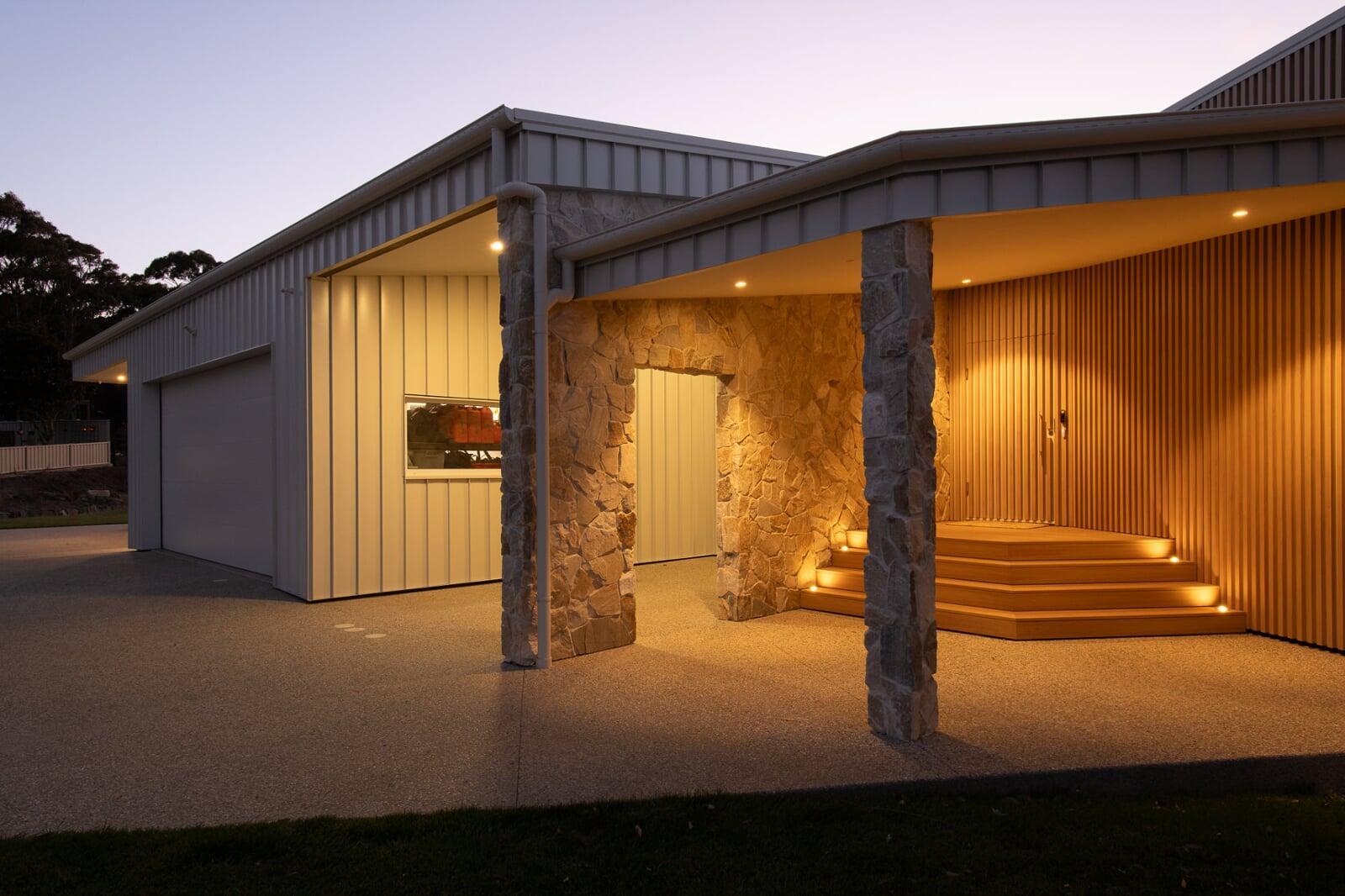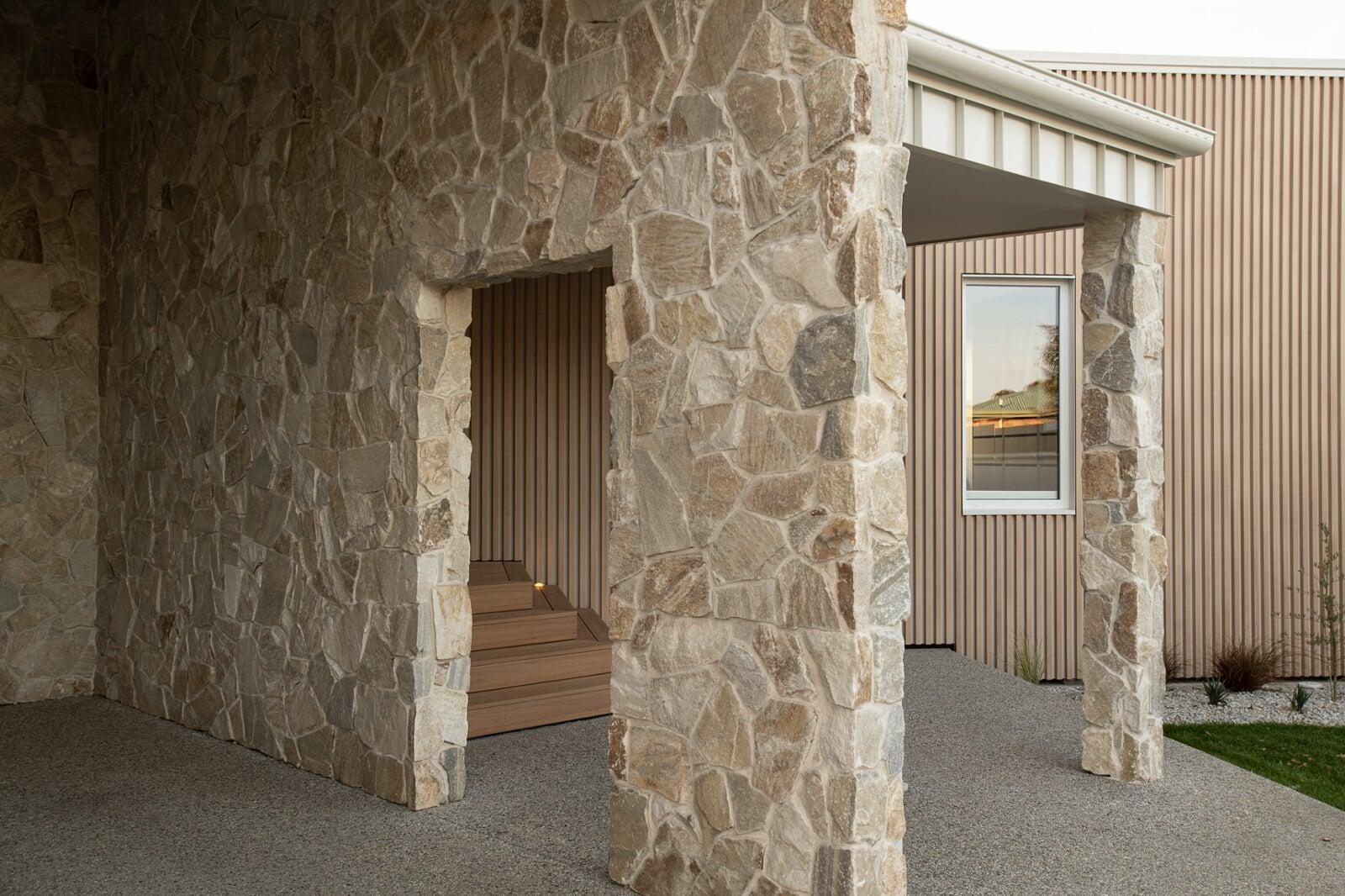 The vertical cladding and stone work at the entry creates a contemporary welcome to the home.